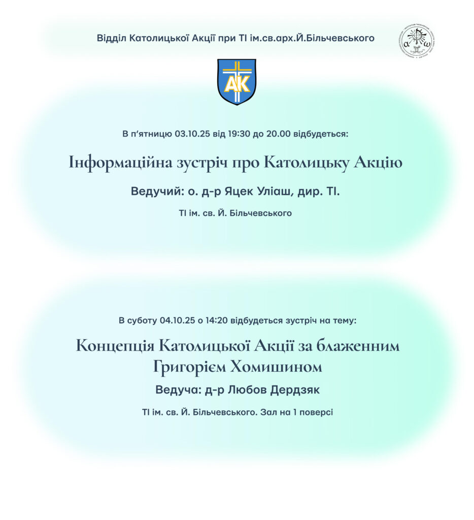 В суботу 4 жовтня 2025 року в Відділі КА при ТІ ім. св. Й. Більчевського відбулася зустріч, на якій викладач ТІ д-р Любов Дердзяк виступила з доповіддю про концепцію Католицької Акції за бл.Г.Хомишином.